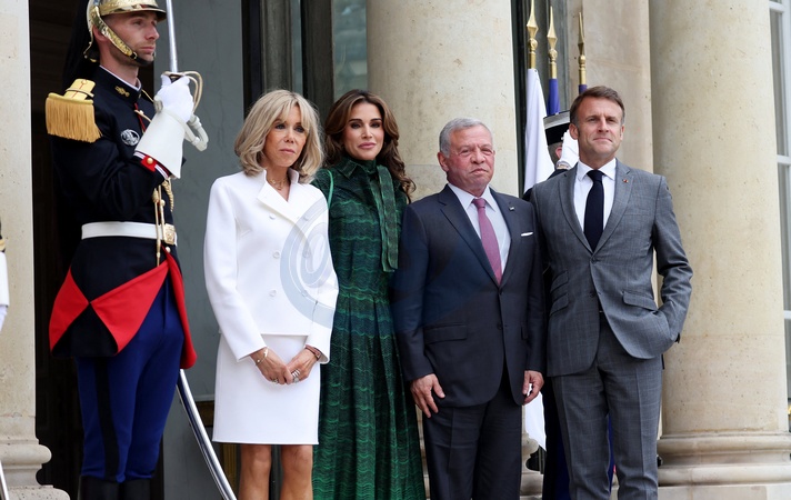 Le Président de la République française, Emmanuel Macron et la première dame Brigitte Macron reçoivent le Roi Abdallah II de Jordanie et la Reine Rania, pour un déjeuner de travail au Palais de l’Elysée à Paris