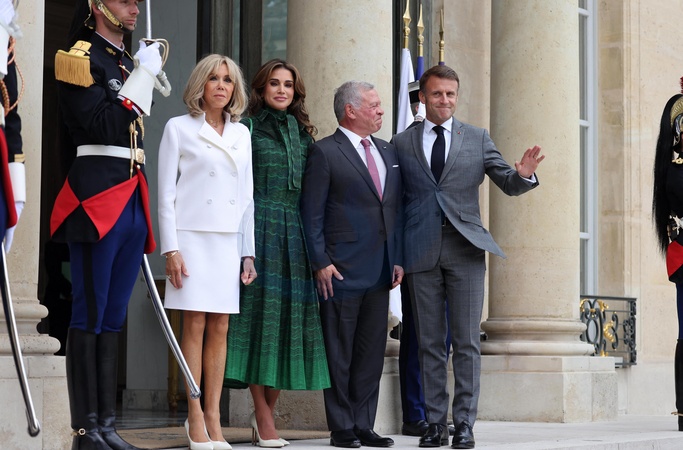 Le Président de la République française, Emmanuel Macron et la première dame Brigitte Macron reçoivent le Roi Abdallah II de Jordanie et la Reine Rania, pour un déjeuner de travail au Palais de l’Elysée à Paris