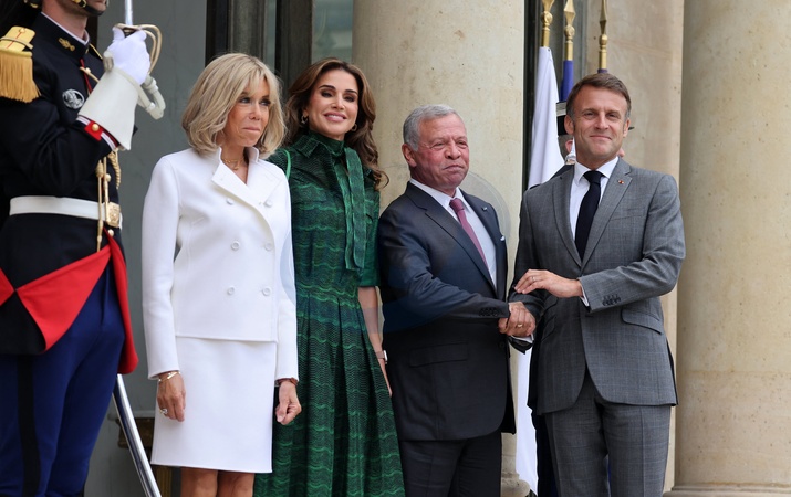 Le Président de la République française, Emmanuel Macron et la première dame Brigitte Macron reçoivent le Roi Abdallah II de Jordanie et la Reine Rania, pour un déjeuner de travail au Palais de l'Elysée à Paris, le 24 juin 2024. © Dominique Jacovides / Bestimage The President of the French Republic, Emmanuel Macron and the first lady Brigitte Macron receive King Abdullah II of Jordan and Queen Rania, for a working lunch at the Elysée Palace in Paris, June 24, 2024.