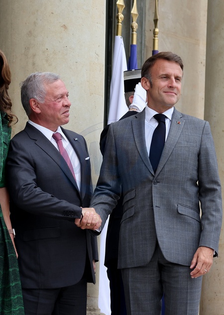 Le Président de la République française, Emmanuel Macron et la première dame Brigitte Macron reçoivent le Roi Abdallah II de Jordanie et la Reine Rania, pour un déjeuner de travail au Palais de l’Elysée à Paris