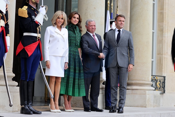 Le Président de la République française, Emmanuel Macron et la première dame Brigitte Macron reçoivent le Roi Abdallah II de Jordanie et la Reine Rania, pour un déjeuner de travail au Palais de l’Elysée à Paris