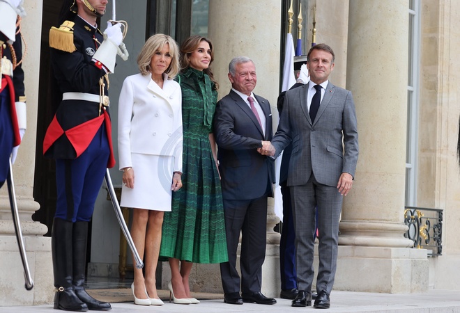 Le Président de la République française, Emmanuel Macron et la première dame Brigitte Macron reçoivent le Roi Abdallah II de Jordanie et la Reine Rania, pour un déjeuner de travail au Palais de l’Elysée à Paris