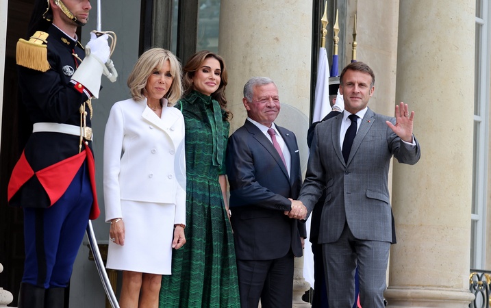 Le Président de la République française, Emmanuel Macron et la première dame Brigitte Macron reçoivent le Roi Abdallah II de Jordanie et la Reine Rania, pour un déjeuner de travail au Palais de l’Elysée à Paris