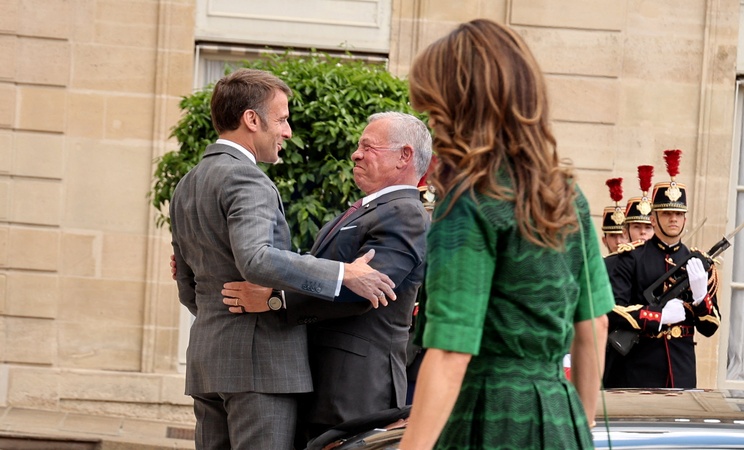 Le Président de la République française, Emmanuel Macron et la première dame Brigitte Macron reçoivent le Roi Abdallah II de Jordanie et la Reine Rania, pour un déjeuner de travail au Palais de l'Elysée à Paris, le 24 juin 2024. © Dominique Jacovides / Bestimage The President of the French Republic, Emmanuel Macron and the first lady Brigitte Macron receive King Abdullah II of Jordan and Queen Rania, for a working lunch at the Elysée Palace in Paris, June 24, 2024.