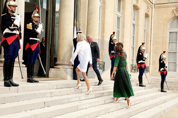 Le Président de la République française, Emmanuel Macron et la première dame Brigitte Macron reçoivent le Roi Abdallah II de Jordanie et la Reine Rania, pour un déjeuner de travail au Palais de l’Elysée à Paris