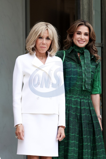 Le Président de la République française, Emmanuel Macron et la première dame Brigitte Macron reçoivent le Roi Abdallah II de Jordanie et la Reine Rania, pour un déjeuner de travail au Palais de l’Elysée à Paris