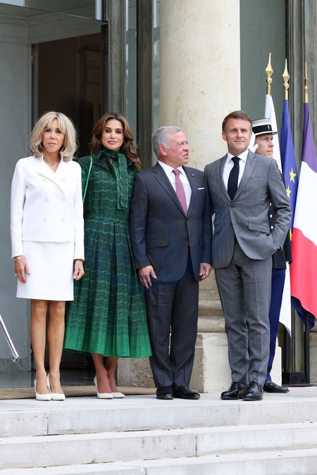 Le Président de la République française, Emmanuel Macron et la première dame Brigitte Macron reçoivent le Roi Abdallah II de Jordanie et la Reine Rania, pour un déjeuner de travail au Palais de l’Elysée à Paris