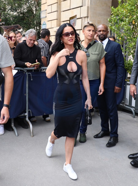 Katy Perry rozdaje autografy i robi sobie selfie z fanami przed swoim hotelem podczas Tygodnia Mody w Paryżu