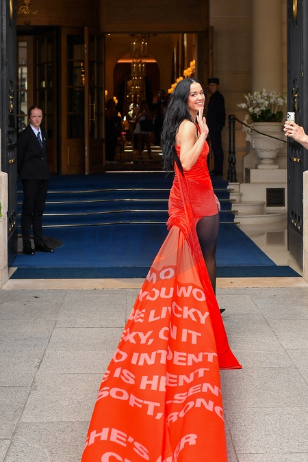 Katy Perry dans une robe avec une longue traîne arrive à l'hôtel Ritz Paris lors de la Fashion Week de Paris, France, le 25 juin 2024. © Pierre Perusseau/Bestimage Katy Perry in a dress with a long train arrives at the Ritz Paris Hotel during Paris Fashion Week in Paris, France on June 25, 2024.