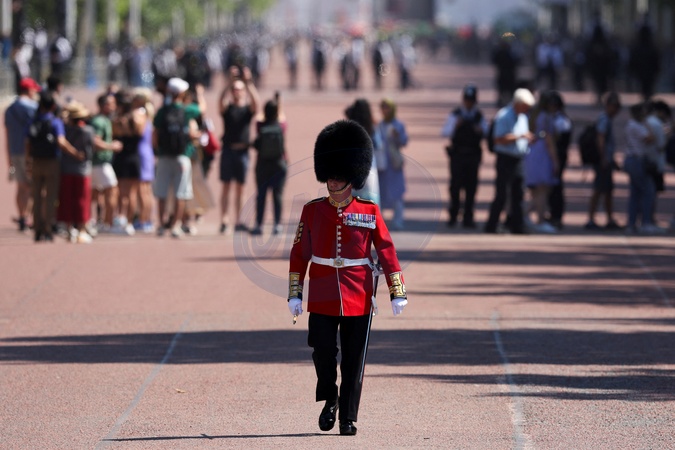 A guard walks as people gather at the Mall on the day of Japan's Emperor Naruhito and Empress Masako's state visit, in London, Britain, June 25, 2024. NO UK USE FOR 48 HOURS, Credit:Avalon.red / Avalon