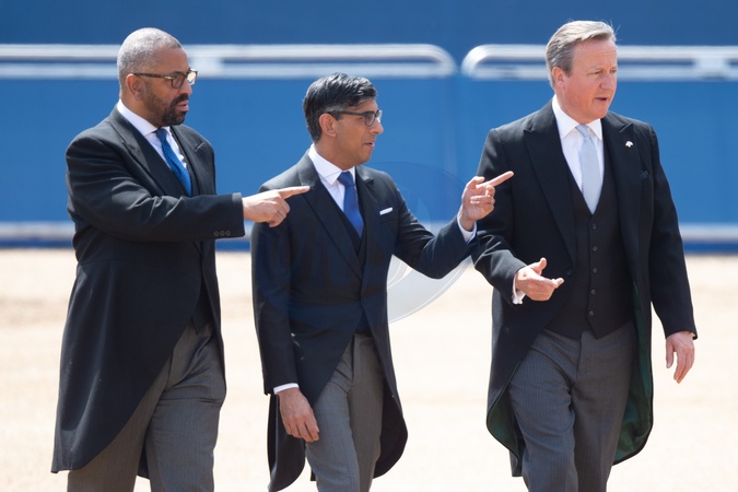 (L-R) - James Cleverly - Secretary of State for the Home Department, British Prime Minister Rishi Sunak and David Cameron - Secretary of State for Foreign, Commonwealth and Development Affairs arrive for the Ceremonial Welcome for the State Visit by The Emperor and Empress of Japan at Horse Guards Parade in London, England, UK on Tuesday 25 June, 2024., Credit:Justin Ng / Avalon