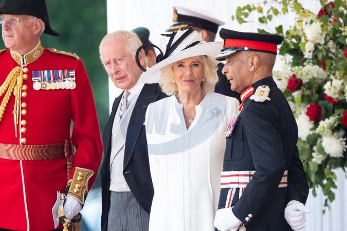 (L-R) - King Charles III, Queen Camilla and Sir Kenneth Olisa, His Majesty's Lord-Lieutenant of Greater London at the Ceremonial Welcome for the State Visit by The Emperor and Empress of Japan at Horse Guards Parade in London, England, UK on Tuesday 25 June, 2024., Credit:Justin Ng / Avalon