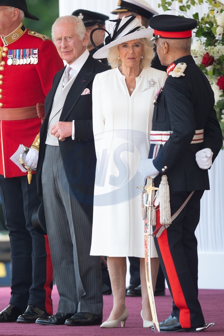 (L-R) - King Charles III, Queen Camilla and Sir Kenneth Olisa, His Majesty's Lord-Lieutenant of Greater London at the Ceremonial Welcome for the State Visit by The Emperor and Empress of Japan at Horse Guards Parade in London, England, UK on Tuesday 25 June, 2024., Credit:Justin Ng / Avalon