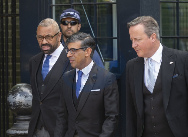 Horse Guards Parade, London, UK. 25th June 2024. Ceremonial welcome of Japanese Emperor Naruhito and Empress Masako on their State Visit to the UK. They are accompanied to the Royal Pavilion on Horse Guards by His Royal Highness The Prince of Wales. After the Guard of Honour give the Royal Salute and play the Japanese National Anthem, the Emperor and King Charles III inspect the Guard of Honour from the 1st Battalion Welsh Guards with the Band of the Welsh Guards. The Emperor and Empress then join The King and Queen, and The Prince of Wales, in a carriage procession along The Mall to Buckingham Palace. Image: James Cleverly, Rishi Sunak and Lord Cameron leave Downing Street to attend the ceremony in Horse Guards, Credit:MALCOLM PARK / Avalon