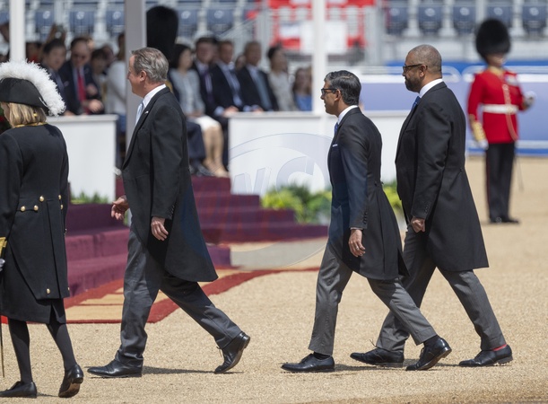 Horse Guards Parade, London, UK. 25th June 2024. Ceremonial welcome of Japanese Emperor Naruhito and Empress Masako on their State Visit to the UK. They are accompanied to the Royal Pavilion on Horse Guards by His Royal Highness The Prince of Wales. After the Guard of Honour give the Royal Salute and play the Japanese National Anthem, the Emperor and King Charles III inspect the Guard of Honour from the 1st Battalion Welsh Guards with the Band of the Welsh Guards. The Emperor and Empress then join The King and Queen, and The Prince of Wales, in a carriage procession along The Mall to Buckingham Palace. Image: Lord Cameron, Rishi Sunak and James Cleverly attend the welcome ceremony., Credit:MALCOLM PARK / Avalon