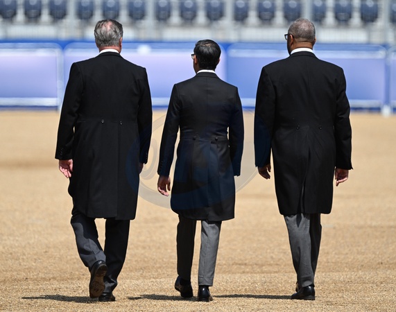 Horse Guards Parade, London, UK. 25th June 2024. Ceremonial welcome of Japanese Emperor Naruhito and Empress Masako on their State Visit to the UK. They are accompanied to the Royal Pavilion on Horse Guards by His Royal Highness The Prince of Wales. After the Guard of Honour give the Royal Salute and play the Japanese National Anthem, the Emperor and King Charles III inspect the Guard of Honour from the 1st Battalion Welsh Guards with the Band of the Welsh Guards. The Emperor and Empress then join The King and Queen, and The Prince of Wales, in a carriage procession along The Mall to Buckingham Palace. Image: Lord Cameron, Rishi Sunak and James Cleverly attend the welcome ceremony., Credit:MALCOLM PARK / Avalon