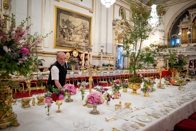 London, UK, 25 June 2024: The finishing touches are applied to the tables in the Ballroom of Buckingham Palace in London before the State Banquet for the state visit of Japan's Emperor Naruhito and his wife, Empress Masako., Credit:Aaron Chown / Avalon
