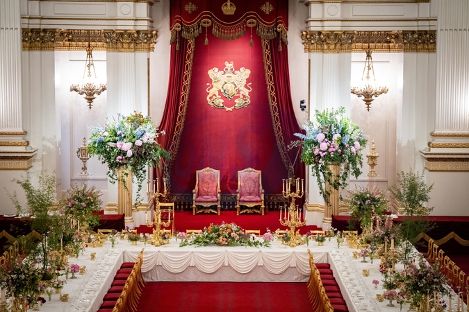 London, UK, 25 June 2024: The finishing touches are applied to the tables in the Ballroom of Buckingham Palace in London before the State Banquet for the state visit of Japan's Emperor Naruhito and his wife, Empress Masako., Credit:Aaron Chown / Avalon