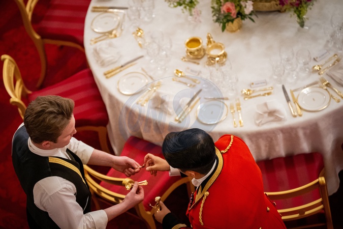 London, UK, 25 June 2024: The finishing touches are applied to the tables in the Ballroom of Buckingham Palace in London before the State Banquet for the state visit of Japan's Emperor Naruhito and his wife, Empress Masako., Credit:Aaron Chown / Avalon