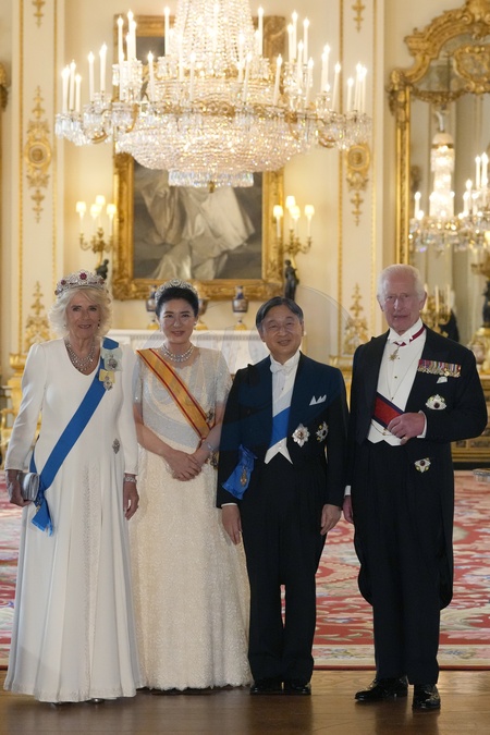 London, UK, 25 June 2024: Britain's King Charles III, right with Japan's Emperor Naruhito, Empress Masako, and Queen Camilla pose for the cameras ahead of the State Banquet during the State Visit to Britain of the Japanese Emperor and Empress in Buckingham Palace in London., Credit:Kirsty Wigglesworth / Avalon