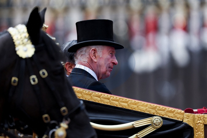 le roi Charles III d'Angleterre - Cérémonie d'accueil et trajet en calèche lors de la visite de l'empereur Naruhito du Japon à Londres le 25 juin 2024. © Photoshot / Panoramic / Bestimage Japan's Emperor Naruhito, accompanied by Britain's King Charles, rides in a carriage on the day of a state visit, in London, Britain, June 25, 2024. NO UK USE FOR 48 HOURS, Credit:Avalon.red / Avalon Cérémonie d'accueil pour la visite d'État de l'empereur et de l'impératrice du Japon - Horse Guards Parade - Londres