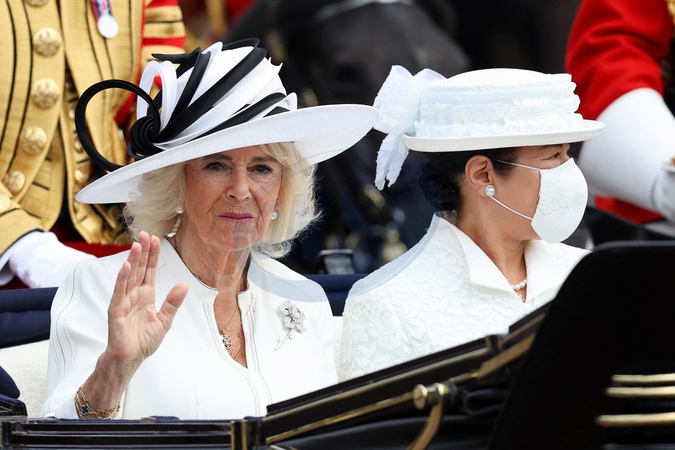 la reine consort Camilla et l'impératrice Masako du Japon - Cérémonie d'accueil et trajet en calèche lors de la visite de l'empereur Naruhito du Japon à Londres le 25 juin 2024. © Photoshot / Panoramic / Bestimage Japan's Empress Masako, accompanied by Britain's Queen Camilla, rides in a carriage on the day of a state visit, in London, Britain, June 25, 2024., Credit:Isabel Infantes / Avalon Cérémonie d'accueil pour la visite d'État de l'empereur et de l'impératrice du Japon - Horse Guards Parade - Londres