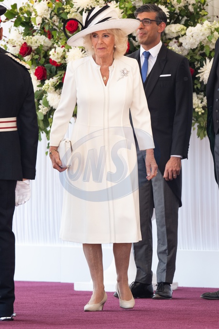 la reine consort Camilla - Cérémonie d'accueil et trajet en calèche lors de la visite de l'empereur Naruhito du Japon à Londres le 25 juin 2024. © Photoshot / Panoramic / Bestimage Queen Camilla at the Ceremonial Welcome for the State Visit by The Emperor and Empress of Japan at Horse Guards Parade in London, England, UK on Tuesday 25 June, 2024., Cérémonie d'accueil pour la visite d'État de l'empereur et de l'impératrice du Japon - Horse Guards Parade - Londres