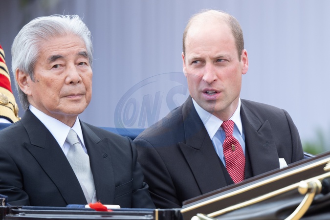 Le prince William, prince de Galles - Cérémonie d'accueil et trajet en calèche lors de la visite de l'empereur Naruhito du Japon à Londres le 25 juin 2024. © Photoshot / Panoramic / Bestimage His Excellency Mr Hirofumi Nakasone, Head of the Official Suite and Prince William - The Prince Of Wales depart the Ceremonial Welcome for the State Visit by The Emperor and Empress of Japan at Horse Guards Parade in London, England, UK on Tuesday 25 June, 2024., Cérémonie d'accueil pour la visite d'État de l'empereur et de l'impératrice du Japon - Horse Guards Parade - Londres