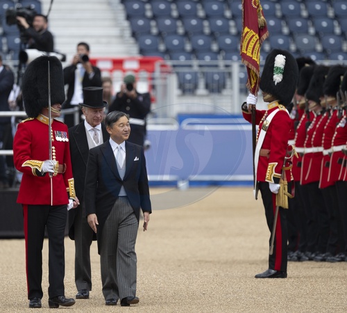 Le roi Charles III d'Angleterre et L'empereur du Japon Naruhito - Cérémonie d'accueil et trajet en calèche lors de la visite de l'empereur Naruhito du Japon à Londres le 25 juin 2024. © Photoshot / Panoramic / Bestimage Horse Guards Parade, London, UK. 25th June 2024. Ceremonial welcome of Japanese Emperor Naruhito and Empress Masako on their State Visit to the UK. They are accompanied to the Royal Pavilion on Horse Guards by His Royal Highness The Prince of Wales. After the Guard of Honour give the Royal Salute and play the Japanese National Anthem, the Emperor and King Charles III inspect the Guard of Honour from the 1st Battalion Welsh Guards with the Band of the Welsh Guards. The Emperor and Empress then join The King and Queen, and The Prince of Wales, in a carriage procèssion along The Mall to Buckingham Palace., Cérémonie d'accueil pour la visite d'État de l'empereur et de l'impératrice du Japon - Horse Guards Parade - Londres