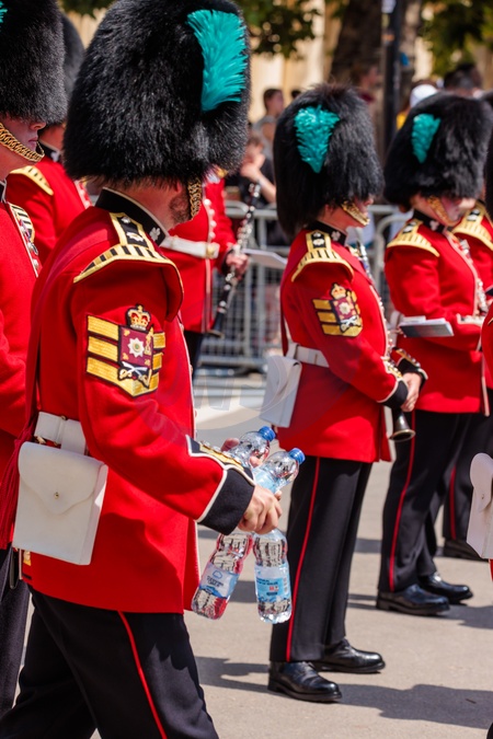 Cérémonie d'accueil et trajet en calèche lors de la visite de l'empereur Naruhito du Japon à Londres le 25 juin 2024. © Photoshot / Panoramic / Bestimage The Mall, London, UK. 25th June 2024. Band of the Irish Guards receive bottles of water as they stand along The Mall in 30 degree heat, the hottest day of the year so far, ahead of the carriage procèssion following a formal welcome on Horse Guards Parade on the Japan State Visit to the UK., Credit:Photo by Amanda Rose / Avalon Cérémonie d'accueil pour la visite d'État de l'empereur et de l'impératrice du Japon - Horse Guards Parade - Londres