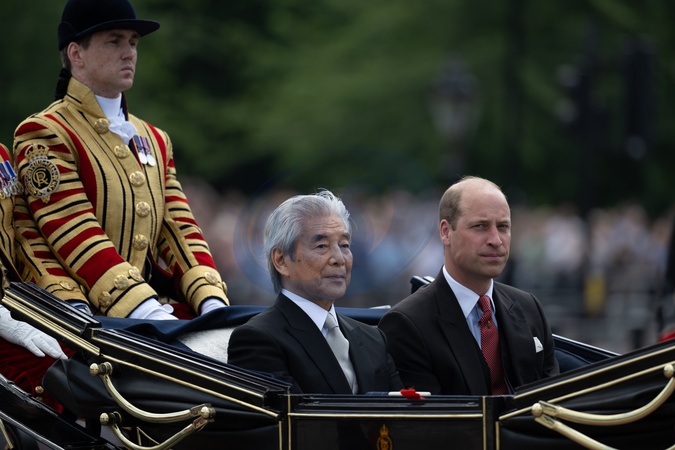 Le prince William, prince de Galles - Cérémonie d'accueil et trajet en calèche lors de la visite de l'empereur Naruhito du Japon à Londres le 25 juin 2024. © Photoshot / Panoramic / Bestimage The Ceremonial Welcome of the Emperor and Empress of Japan during their state visit at the Horse Guards and Buckingham Palace. Emperor Naruhito and Empress Masako of Japan are beginning a three-day state visit to the UK. London. June 25 2024., Cérémonie d'accueil pour la visite d'État de l'empereur et de l'impératrice du Japon - Horse Guards Parade - Londres