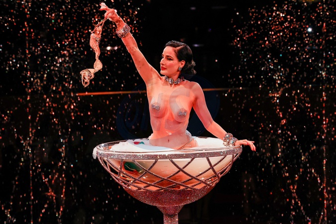 Dita Von Teese zamyka pokaz mody Alexis Mabille Haute-Couture jesień-zima 2024/2025 podczas Tygodnia Mody w Paryżu