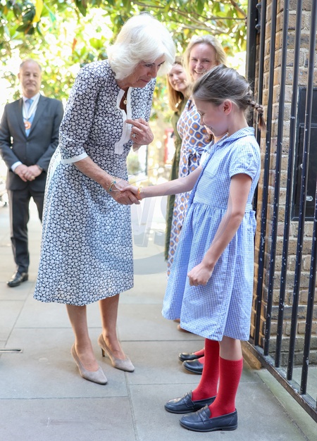 Queen Camilla shakes hands with Marina, aged 9, as she arrives at Christ Church C of E Primary School's Literary Festival on June 26, 2024 in London, England. NO UK USE FOR 48 HOURS, Credit:Avalon.red / Avalon