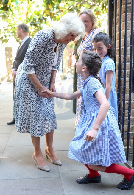 Queen Camilla shakes hands with Marina, aged 9, as she arrives at Christ Church C of E Primary School's Literary Festival on June 26, 2024 in London, England. NO UK USE FOR 48 HOURS, Credit:Avalon.red / Avalon