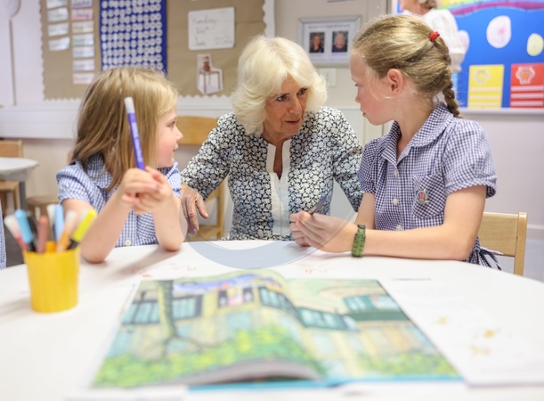 Queen Camilla speaks to pupils as she visits a Reception class and hears about the "Shepherd and Sheep" reading initiative, which allocates new pupils in Reception to a Year 6 pupil, who acts as a friend and role-model throughout the new pupils first year at school, during her visit to Christ Church C of E Primary School's Literary Festival on June 26, 2024 in London, England. NO UK USE FOR 48 HOURS, Credit:Avalon.red / Avalon