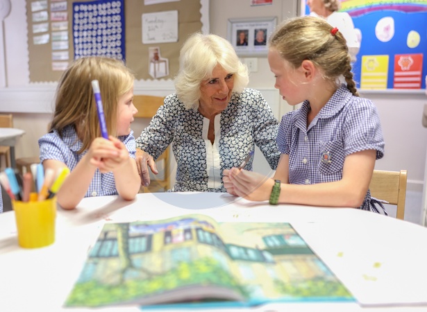 Queen Camilla speaks to pupils as she visits a Reception class and hears about the "Shepherd and Sheep" reading initiative, which allocates new pupils in Reception to a Year 6 pupil, who acts as a friend and role-model throughout the new pupils first year at school, during her visit to Christ Church C of E Primary School's Literary Festival on June 26, 2024 in London, England. NO UK USE FOR 48 HOURS, Credit:Avalon.red / Avalon