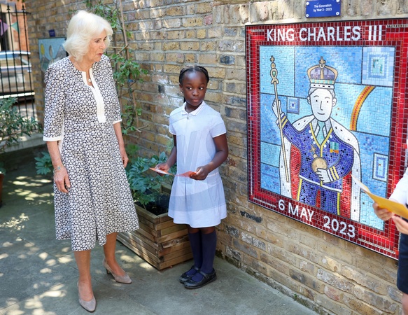 Queen Camilla views a ceramic tiled mural celebrating the coronation of King Charles III in the school's garden during her visit to Christ Church C of E Primary School's Literary Festival on June 26, 2024 in London, England. NO UK USE FOR 48 HOURS, Credit:Avalon.red / Avalon