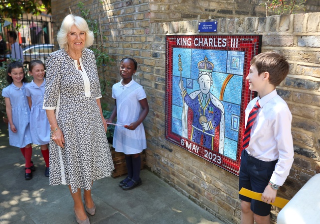 Queen Camilla with pupils as she views a ceramic tiled mural celebrating the coronation of King Charles III in the school's garden during her visit to Christ Church C of E Primary School's Literary Festival on June 26, 2024 in London, England. NO UK USE FOR 48 HOURS, Credit:Avalon.red / Avalon