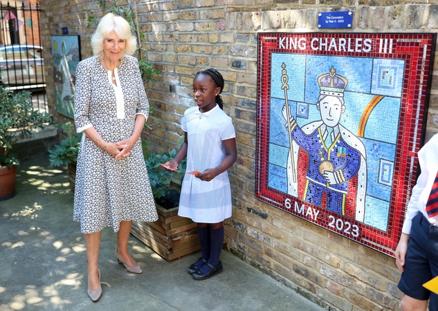 Queen Camilla with pupils as she views a ceramic tiled mural celebrating the coronation of King Charles III in the school's garden during her visit to Christ Church C of E Primary School's Literary Festival on June 26, 2024 in London, England. NO UK USE FOR 48 HOURS, Credit:Avalon.red / Avalon