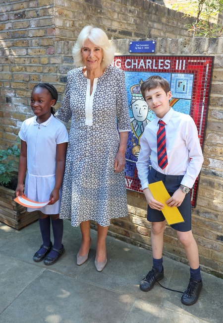 Queen Camilla poses with pupils in front of a ceramic tiled mural celebrating the coronation of King Charles III in the school's garden during her visit to Christ Church C of E Primary School's Literary Festival on June 26, 2024 in London, England. NO UK USE FOR 48 HOURS, Credit:Avalon.red / Avalon