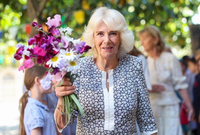 Queen Camilla smiles as she holds a bouquet of flower during her visit to Christ Church C of E Primary School's Literary Festival on June 26, 2024 in London, England. NO UK USE FOR 48 HOURS, Credit:Avalon.red / Avalon