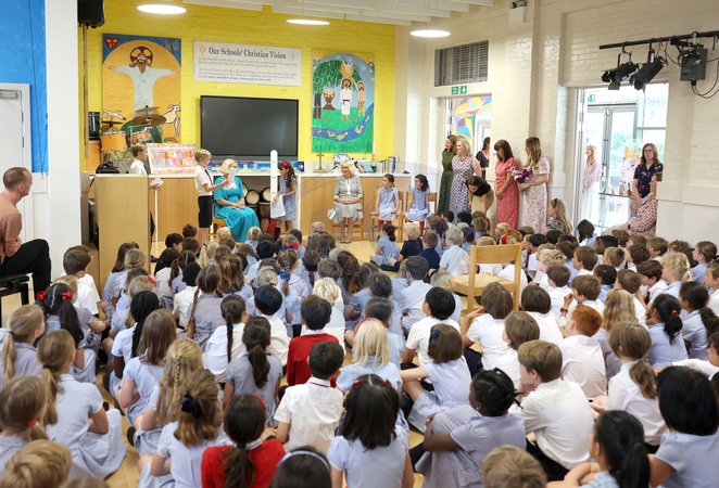 A general view as Queen Camilla attends a short assembly to hear two pupils speak about their favourite books during her visit to Christ Church C of E Primary School's Literary Festival on June 26, 2024 in London, England. NO UK USE FOR 48 HOURS, Credit:Avalon.red / Avalon