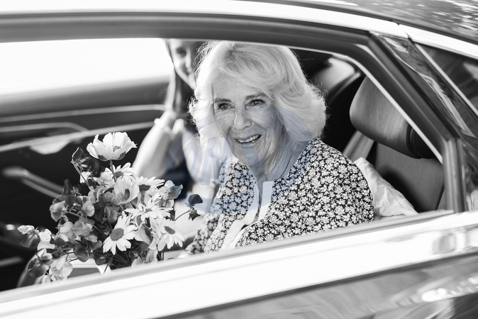 (EDITORS NOTE: This image has been converted to black and white.) Queen Camilla smiles as she departs after her visit to Christ Church C of E Primary School's Literary Festival on June 26, 2024 in London, England. NO UK USE FOR 48 HOURS, Credit:Avalon.red / Avalon