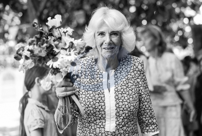 (EDITORS NOTE: This image has been converted to black and white.) Queen Camilla smiles as she holds a bouquet of flower during her visit to Christ Church C of E Primary School's Literary Festival on June 26, 2024 in London, England. NO UK USE FOR 48 HOURS, Credit:Avalon.red / Avalon