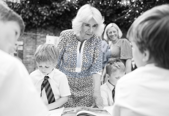 (EDITORS NOTE: This image has been converted to black and white.) Queen Camilla speaks to children about their favourite books during her visit to Christ Church C of E Primary School's Literary Festival on June 26, 2024 in London, England. NO UK USE FOR 48 HOURS, Credit:Avalon.red / Avalon