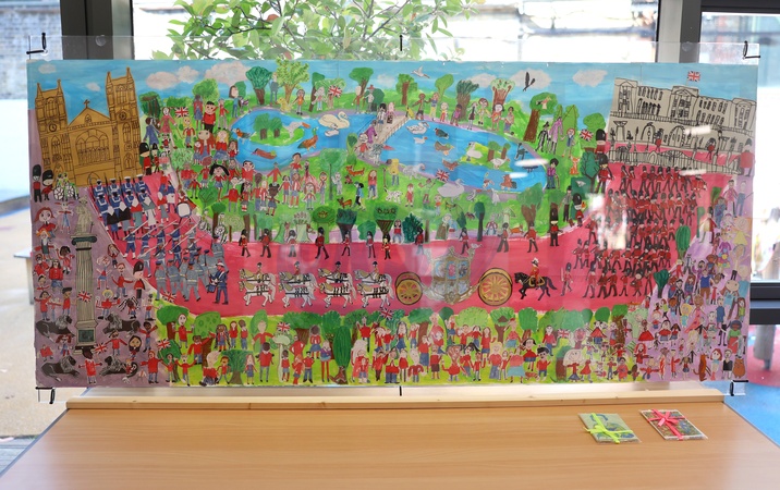 Artwork created by pupils depicting the coronation of King Charles III and Queen Camilla during her visit to Christ Church C of E Primary School's Literary Festival on June 26, 2024 in London, England. NO UK USE FOR 48 HOURS, Credit:Avalon.red / Avalon