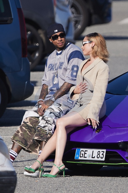 Exclusif - Le rappeur Tyga tourne un clip sur le port de Saint-Tropez avec pour partenaire, une Lamborghini Huracán EVO Spyder le 26 juin 2024. Rapper Tyga shoots a video on the port of Saint-Tropez with a Lamborghini Huracán EVO Spyder as his partner on 26 June 2024.