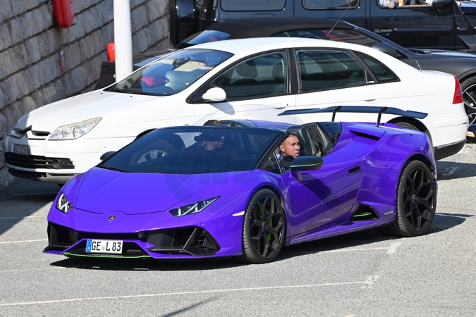 Exclusif - Le rappeur Tyga tourne un clip sur le port de Saint-Tropez avec pour partenaire, une Lamborghini Huracán EVO Spyder le 26 juin 2024. Rapper Tyga shoots a video on the port of Saint-Tropez with a Lamborghini Huracán EVO Spyder as his partner on 26 June 2024.