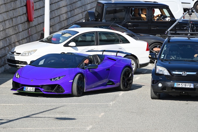 Exclusif - Le rappeur Tyga tourne un clip sur le port de Saint-Tropez avec pour partenaire, une Lamborghini Huracán EVO Spyder le 26 juin 2024. Rapper Tyga shoots a video on the port of Saint-Tropez with a Lamborghini Huracán EVO Spyder as his partner on 26 June 2024.
