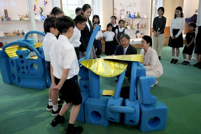 Japans Emperor Naruhito and Empress Masako meet children from the Japan School participating in the 'Build-It-Construction Challenge' at the Young V&A in Bethnal Green in London, Thursday, June 27, 2024. NO UK USE FOR 48 HOURS
